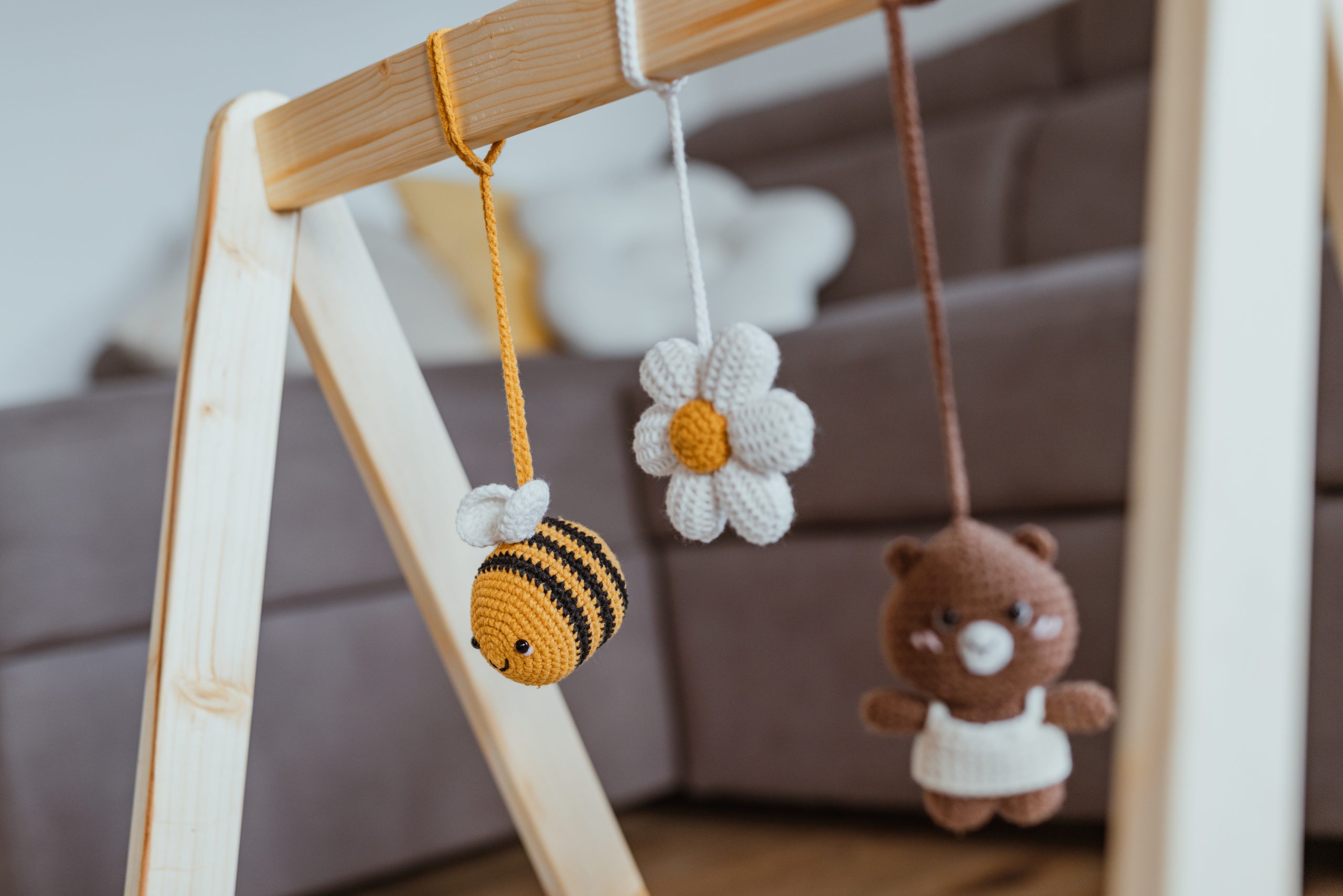Vsaka igračka (čebelica, marjetica in medvedek) je ročno pletena iz mehke, kakovostne preje, prijetne na otip in varne za dojenčke.